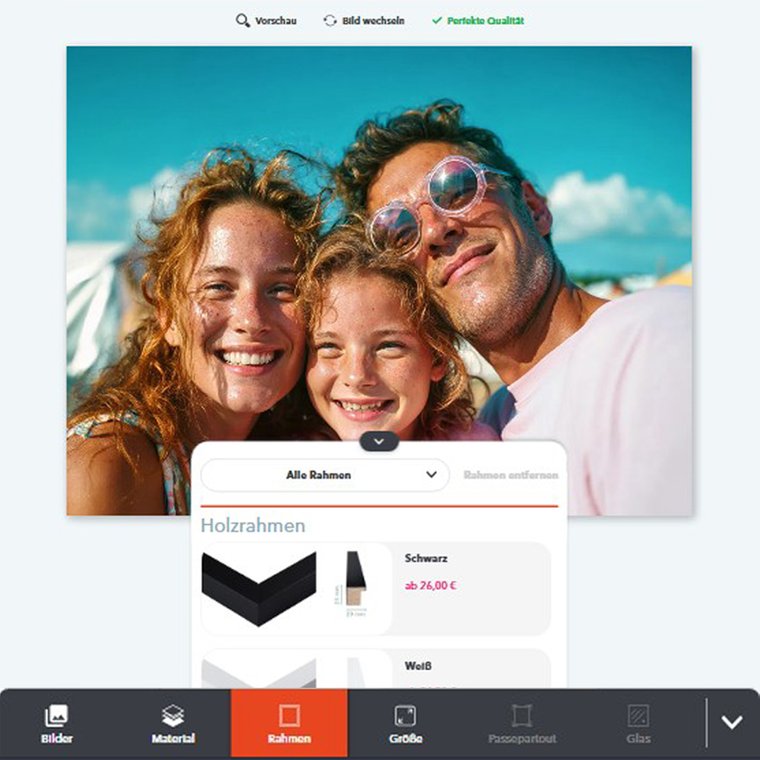 Wenn etwas nicht optimal ist, bekommst Du sofort Feedback – ganz ohne technisches Wissen. Du siehst also direkt, ob Dein Foto in der gewählten Größe gestochen scharf gedruckt wird oder ob Du lieber ein kleineres Format wählen solltest.